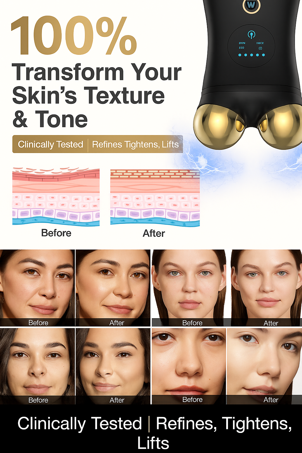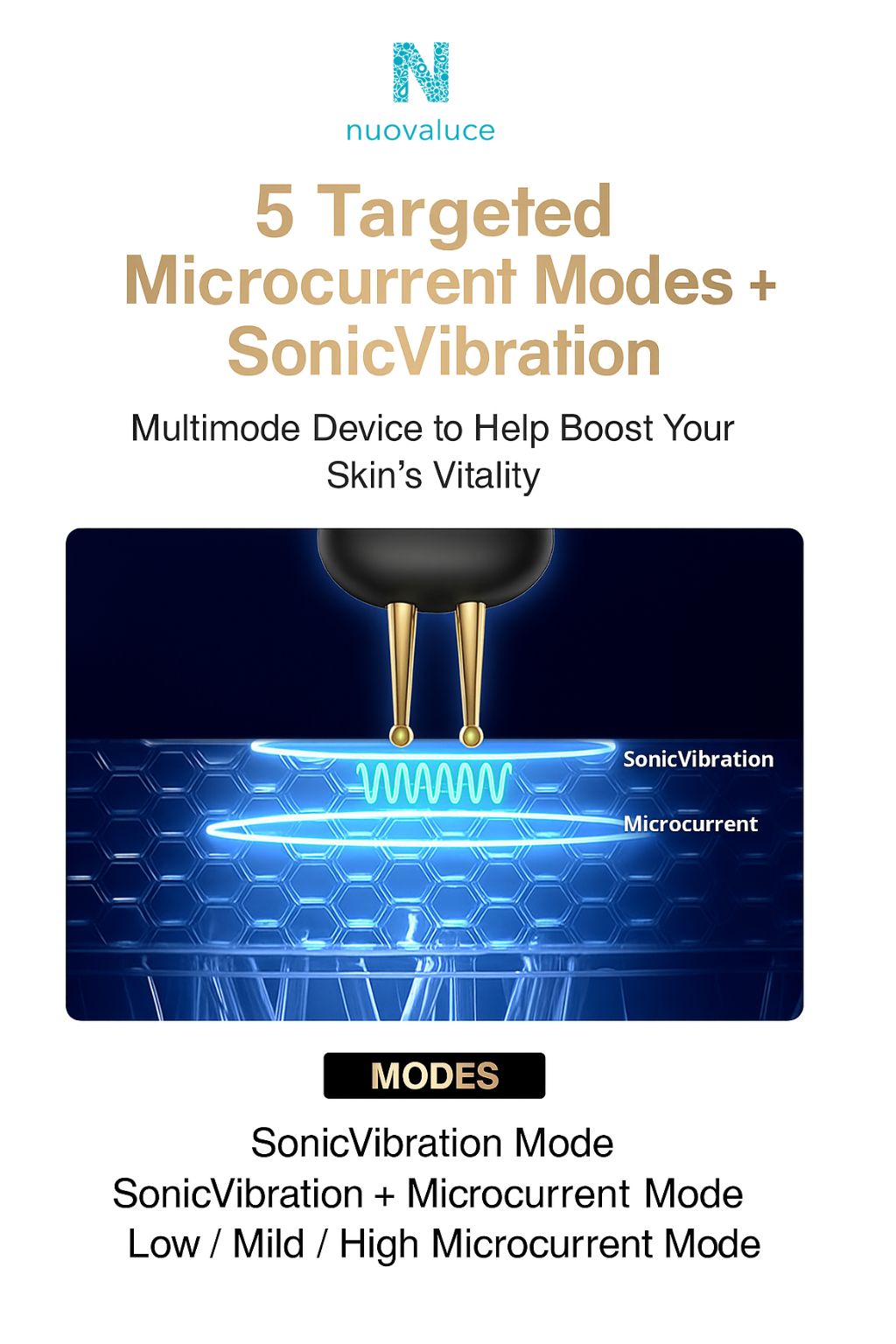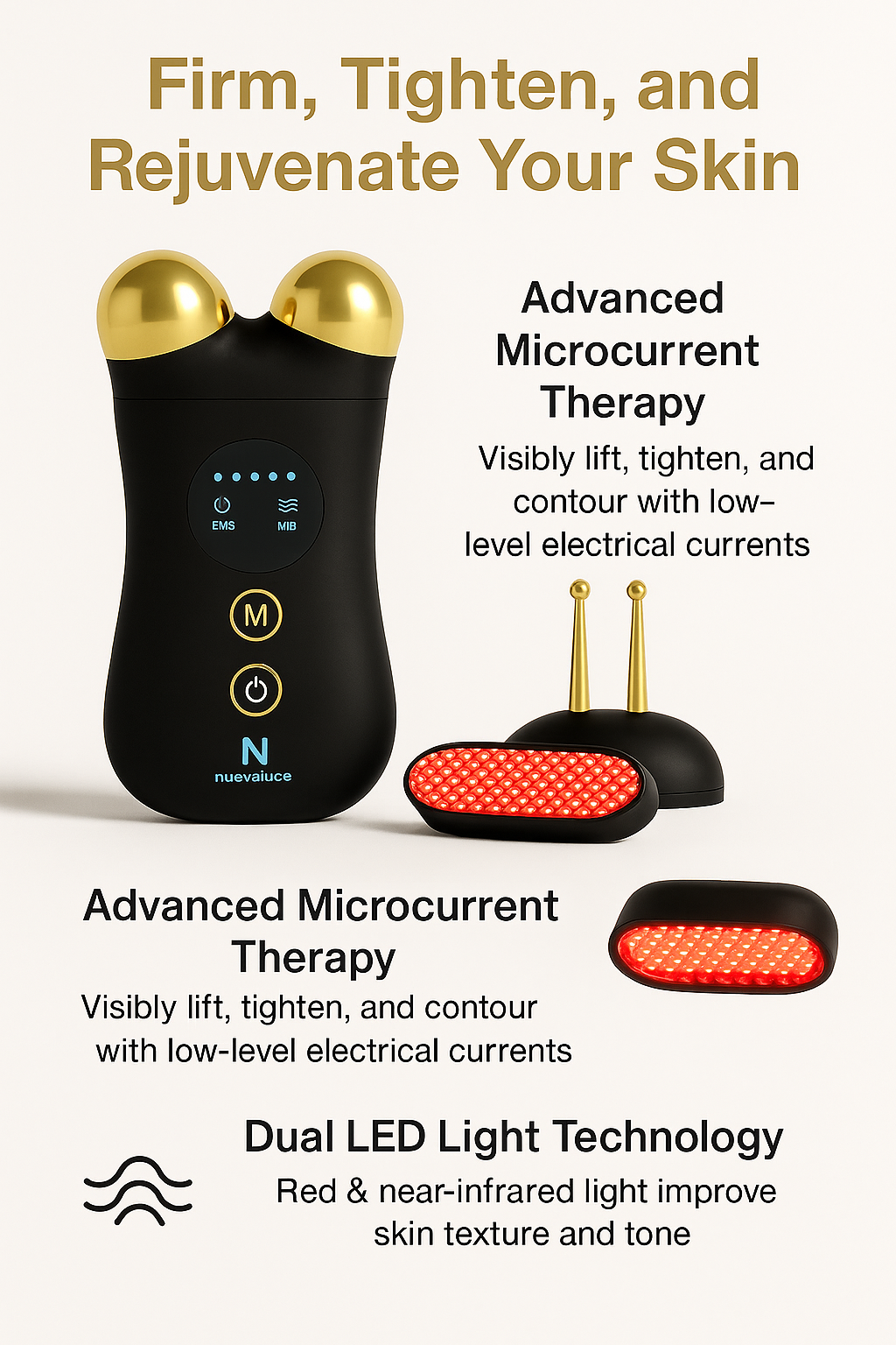 The device combines microcurrent, red + near-infrared light therapy, and high-frequency vibration to lift, tone, and rejuvenate the skin.
