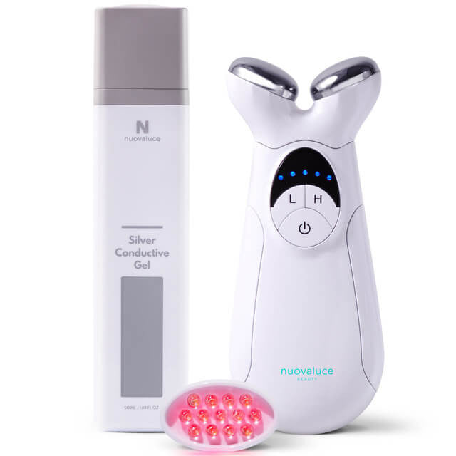 Nuovaluce Features microcurrent. This regulated energy reactivates collagen formation, helping redefine facial features and structure. The Microcurrent stimulates muscles three layers deep, ultimately boosting skin firmness.