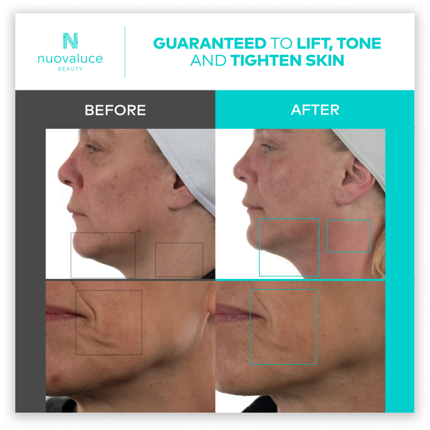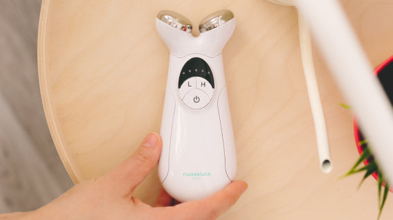 Nuovaluce Features microcurrent. This regulated energy reactivates collagen formation, helping redefine facial features and structure. The Microcurrent stimulates muscles three layers deep, ultimately boosting skin firmness.